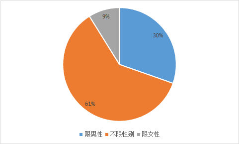 2019年重慶公務員有68%的崗位不限性別,共招錄806人,占招錄人數的61%,在性別限制的崗位中,男性崗位有201個,招錄403人,占30%,女性的崗位有66個,招錄118人,占9%,而去年上半年在招錄的所有職位中,限男性的職位一共有196個,共招錄336人,占總招錄人數的28%。限女性的職位一共有80個,共招錄115人,占總招錄人數的9%。相比去年來說,今年不限崗位招錄人數增加64人,限男性招錄人數增加67人,限女性招錄增加3人。