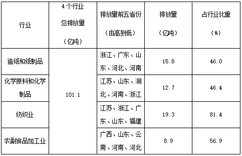根據“2012年,在調查統計的41個重點工業行業中,廢水排放量位于前4位的行業依次為造紙和紙制品業、化學原料和化學制品制造業、紡織業、農副食品加工業”可知,“造紙和紙制品業”“化學原料和化學制品制造業”“紡織業”和“農副食品加工業”是廢水排放量位于前4位的行業,也就是四個研究對象;根據“4個行業的廢水排放量101.1億噸”“2012年,造紙和紙制品業廢水排放量前5位的省份依次是浙江、廣東、山東、河北和河南,5個省份造紙和紙制品廢水排放量15.8億噸,占該行業重點調查工業企業廢水排放量的46.0%”可知,“4個行業總排放量”“排放量前五省份”“前五省份總排放量”“前五省份總排放量占行業比重”是四個研究指標。